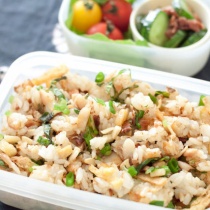 45弁当=さくっと食べられる軽めのお弁当。ということで。 鯵の開きを焼いて、ほぐしたやつと、常備菜っぽいふりかけをごはんに混ぜました。 ●鯵ごはん ★★★ 〈入っているもの〉 ・鯵開き ・キャベツの外葉の小海老入りふりかけ ・きざみ揚げ ・しそ ・万能ね ...